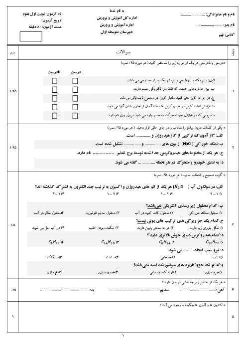 آزمون نوبت اول علوم تجربی فصل 1 تا 6 پایه نهم