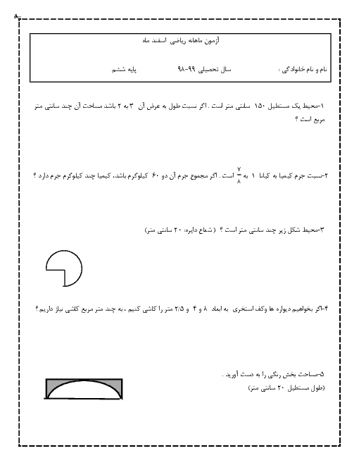 این آزمون تشریحی از فصل 5 و 6 ریاضی ششم تهیه شده است .