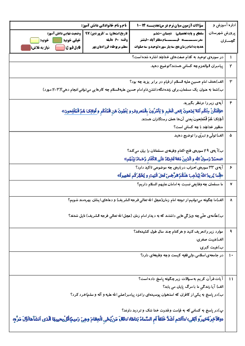 ارزشیابی هدیه های آسمانی ششم دبستان قیام + جواب | درس 1 تا 13