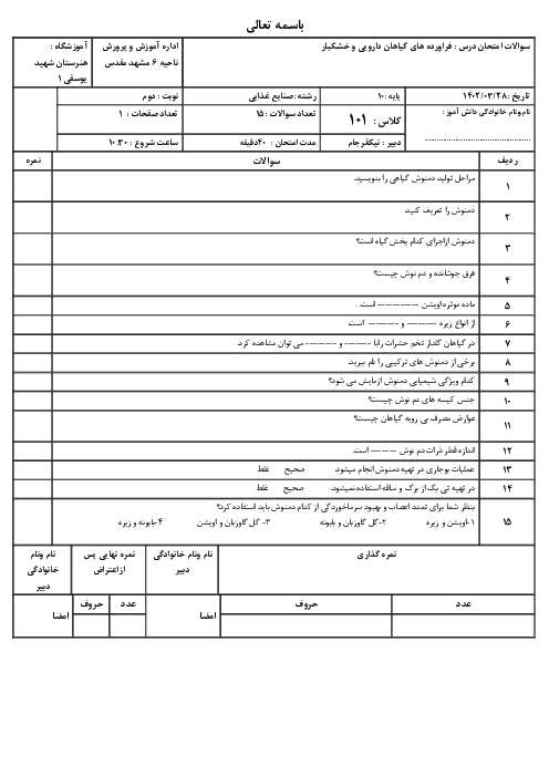 امتحان فرآوری گیاهان دارویی و خشکبار دهم هنرستان صنایع غذایی شهید یوسفی | فصل 5: تولید دمنوشهای گیاهی