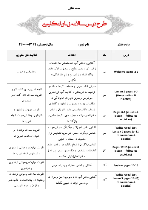 طرح درس سالانه انگلیسی هفتم | درس 1 تا 8