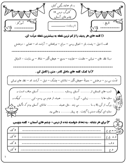 کاربرگ درس 17 فارسی سوم: چشم های آسمان