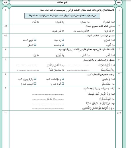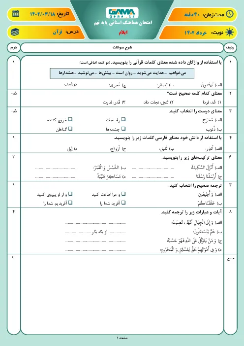آزمون هماهنگ استانی خرداد 1402 قرآن پایه نهم استان ایلام