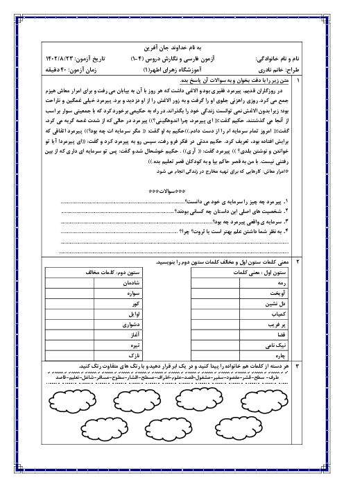 آزمون فارسی و نگارش پایهی چهارم آموزشگاه زهرای اطهر | درس 1 تا 4