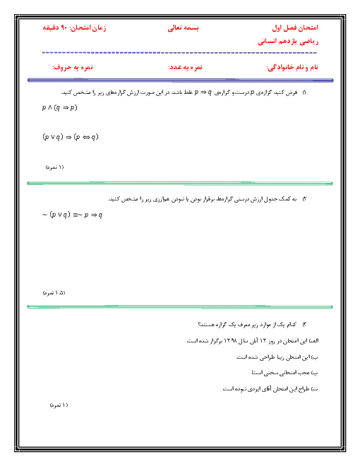 سوالات امتحان جامع فصل 1 ریاضی و آمار یازدهم انسانی دبیرستان دکتر حسابی | آشنایی با منطق و استدلال ریاضی