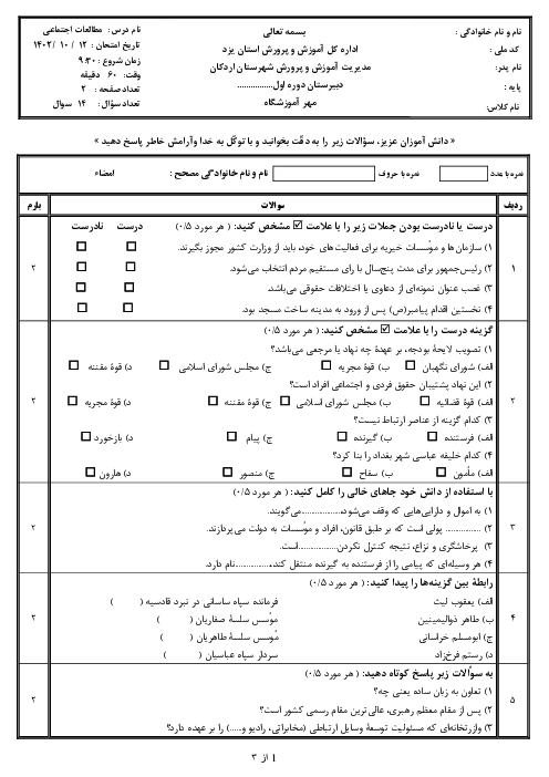 آزمون نوبت اول مطالعات هشتم هماهنگ شهرستان اردکان در دیماه 1402