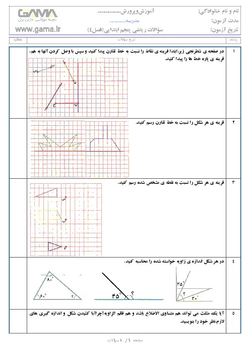 نمونه سوال امتحانی ریاضی فصل 4: تقارن و چند ضلعی ها پایه پنجم دبستان