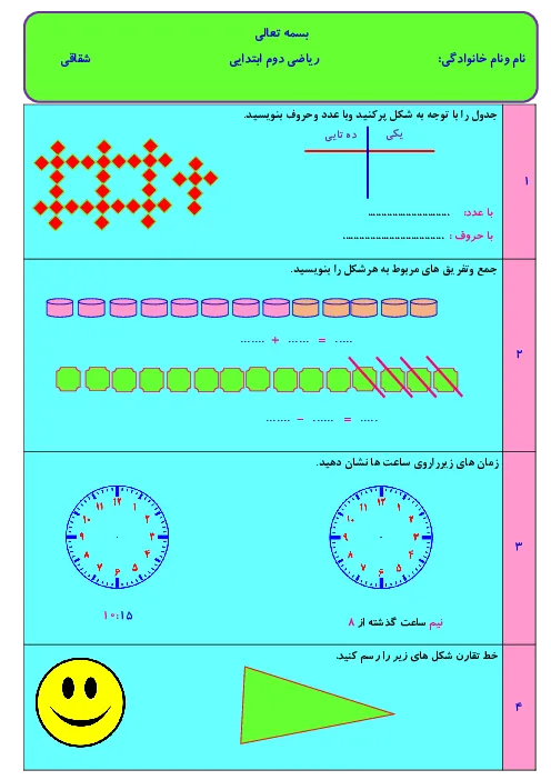 ارزشیابی مرور فصل 1 تا 8 کتاب ریاضی دوم دبستان صابران