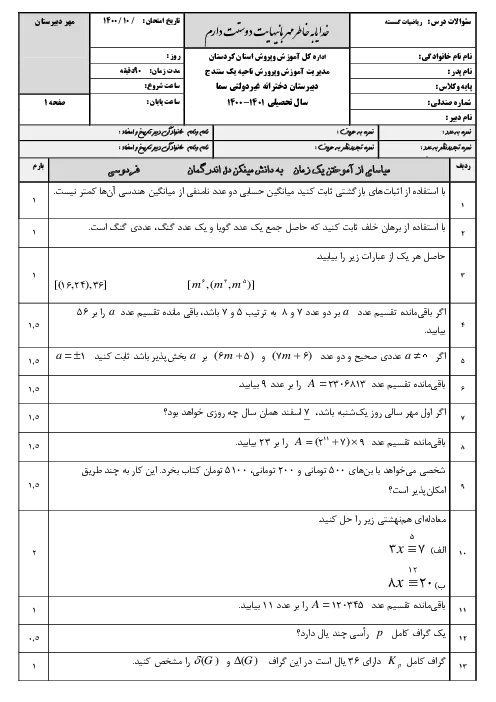 سوالات آزمون نوبت اول ریاضیات گسسته