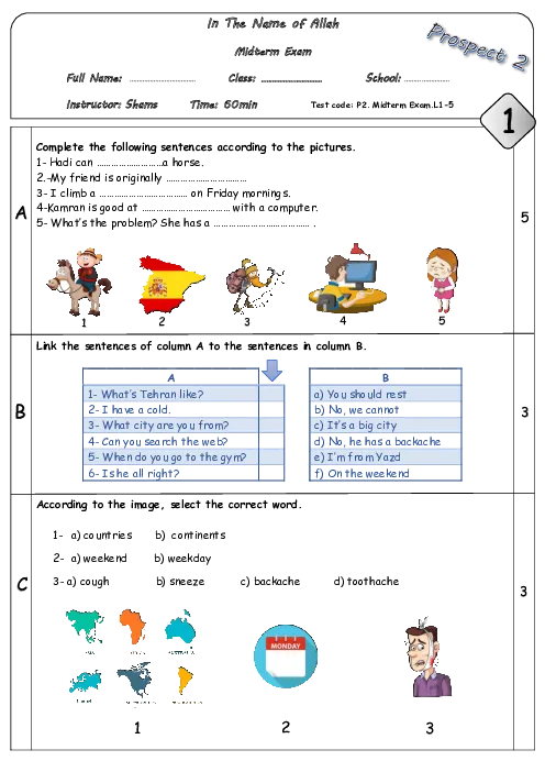 آزمون میان ترم دوم انگلیسی هشتم مدرسه شهدای فرهنگی | درس 1 تا 5