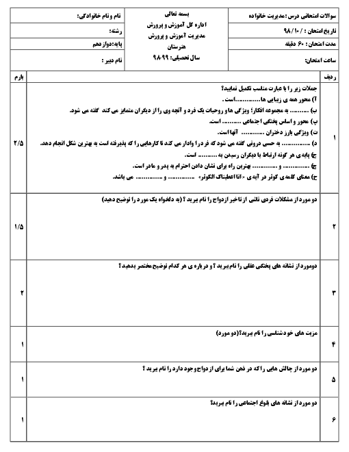 نمونه سوال امتحان ترم اول مدیریت خانواده و سبک زندگی (دختران) دوازدهم هنرستان فنی نمونه رشد