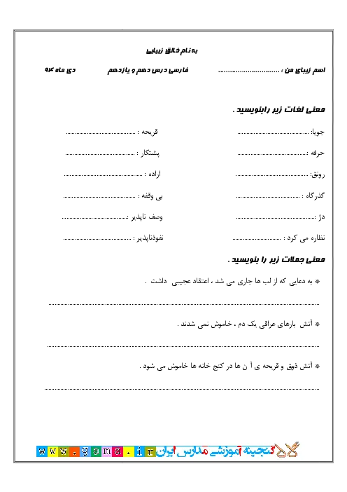 ارزشیابی لغات درس 10 و 11 فارسی چهارم دبستان