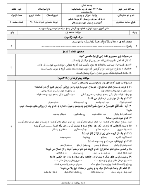 آزمون نوبت دوم خرداد 1402 پیامهای آسمان پایه هفتم همراه با پاسخنامه تشریحی