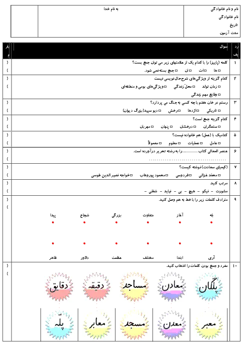 آزمون مستمر فارسی ششم دبستان | درس اول: معرفت آفریدگار تا درس هشتم: دریاقُلی