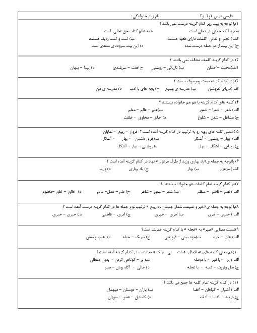 نمونه سوال امتحانی تستی فارسی درسهای 1 تا 3 پایه ششم دبستان
