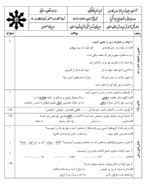 آزمون میان ترم فارسی (امتحان مستمر)