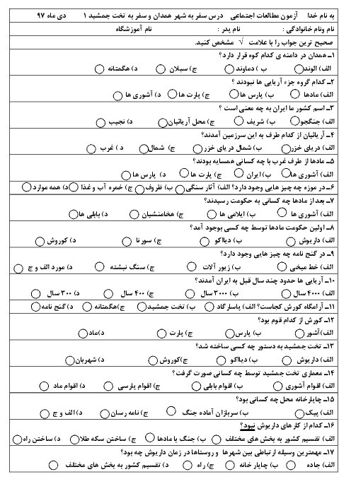 پاسخنامه آزمون دی ماه 97 درس 11 و 12( سفربه شهر همدان و سفر به تخت جمشید1)\n1ـ ا لف 2ـ د 3ـ ج 4ـ ب 5ـ الف 6ـ د 7ـ ج 8ـ ب 9ـ د 10ـ الف 11ـ الف 12ـ ب 13ـ الف\n14ـ ج 15ـ د 16ـ ب 17ـ ج\n18ـ راه شاهی 19ـ جشن ها – عید نوروز 20ـ پارسی باستان 21ـ باهم متحد نبودند و سپاه منظمی نداشتند. 22ـ داریوش 23ـ کنار راه ها 24ـ دیااکو 25ـ شهربان
