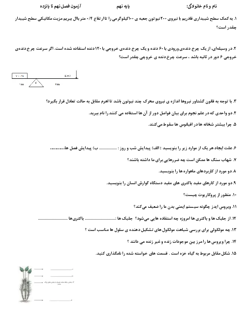 نمونه سوال امتحانی ارزشیابی مستمر علوم تجربی نهم دبیرستان فصل 9 تا 15