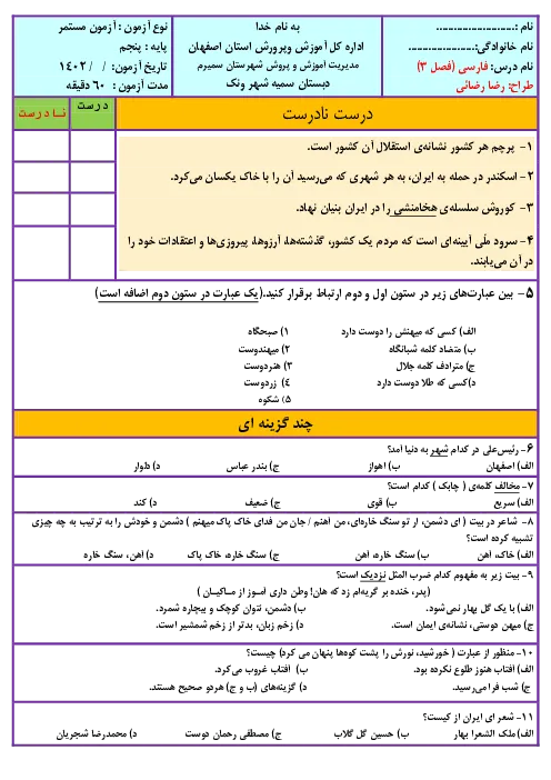 نمونه سوال امتحانی مستمر فارسی و نگارش فصل 3: ایران من (درس 6 تا 8) پایه پنجم دبستان همراه با پاسخنامه تشریحی