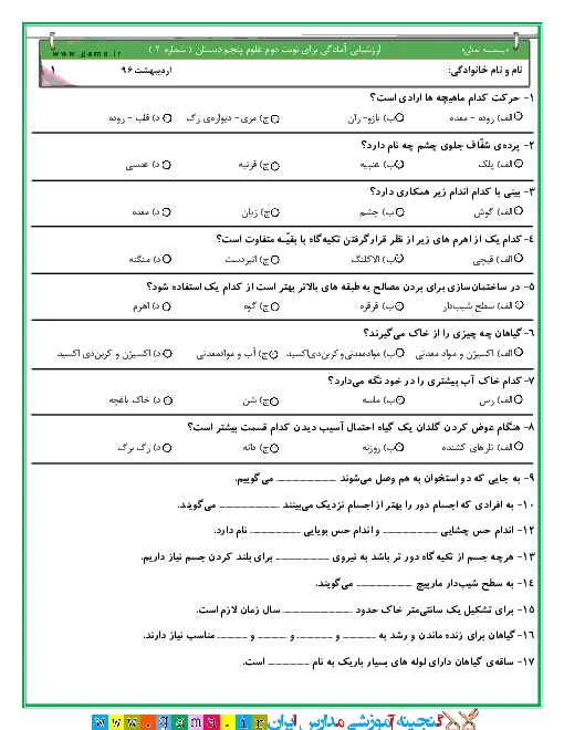 نمونه سوال امتحانی ترم دوم| اردیبهشت و خرداد 96 « علوم » پنجم دبستان به همراه پاسخنامه تشریحی