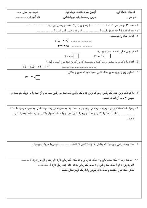سه سری نمونه سوال ارزشیابی ریاضی دوم دبستان | نوبت دوم خرداد 1403 دبستان شهدای فرهنگی