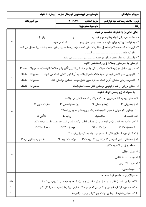 سوالات آزمون نوبت دوم سلامت و بهداشت دوازدهم هنرستان شهید مطهری | خرداد 1401