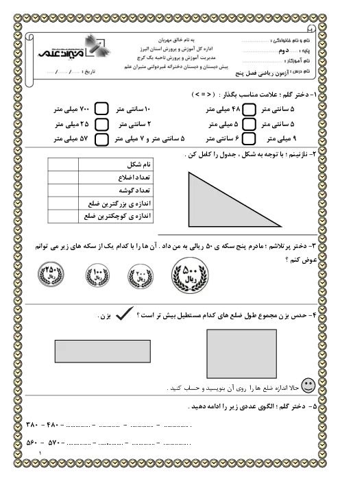 مجموعه نمونه سوالات امتحانی مداد کاغذی درس ریاضی فصل 5 تا 8پایه دوم دبستان