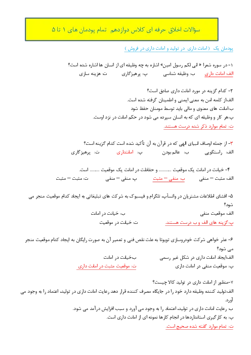 سوالات طبقه بندی شده اخلاق حرفهای پودمان های 1 تا 5 پایه دوازدهم همراه با پاسخنامه تشریحی