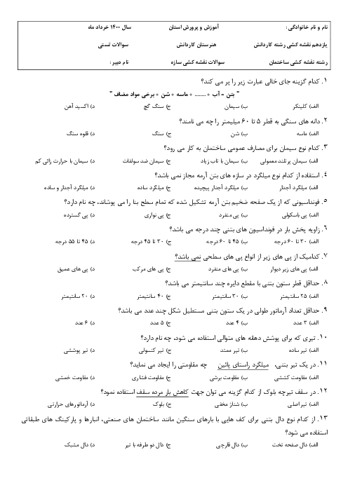 سوالات آزمون تئوری نوبت دوم نقشه کشی سازه درجه 1 یازدهم کاردانش | خرداد 1400