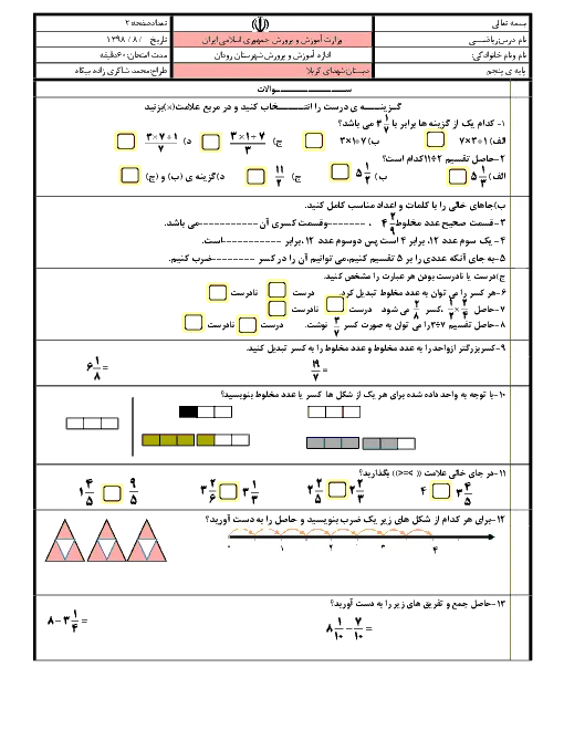 آزمون مداد کاغذی ریاضی پنجم دبستان شهدای کربلا | فصل 2: کسر