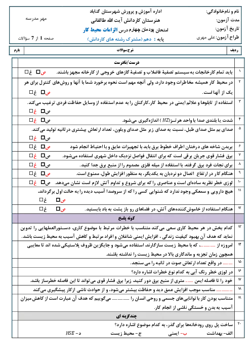 نمونه سوالات امتحانی الزامات محیط کار دهم هنرستان | فصل 4: ایمنی و بهداشت محیط کار