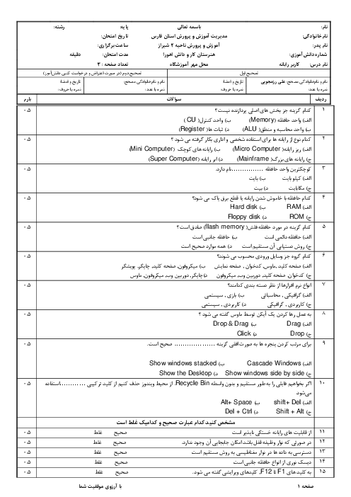 نمونه سوالات امتحان پایانی کاربر رایانه دهم هنرستان خرداد همراه با پاسخنامه