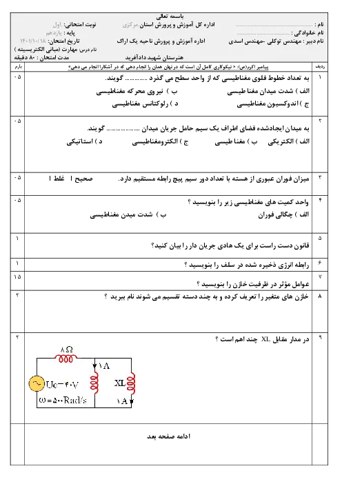امتحان ترم اول برق کار صنعتی درجه 2 (مهارت مبانی الکتریسیته) یازدهم هنرستان شهید داد آفرید | دی 1401