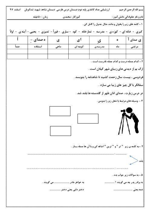 ارزشیابی مداد کاغذی فارسی دوم دبستان شاهد شهید تندگویان | درس 8 تا 13