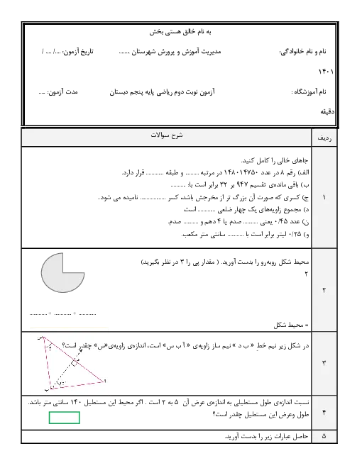 ارزشیابی نوبت دوم ریاضی پنجم دبستان | اردیبهشت 1401