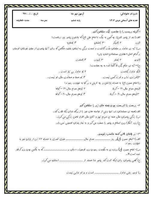 نمونه سوال مداد کاغذی هدیه های آسمانی درس 1 تا 3 پایه ششم دبستان همراه با پاسخنامه تشریحی