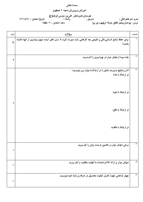 آزمون پودمانی اخلاق حرفهای دوازدهم هنرستان علی بن موسی الرضا | پودمان 5: بهرهوری