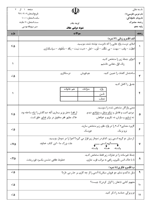 نمونه سوال امتحانی ترم دوم خرداد 1397 فارسی (1) پایه دهم