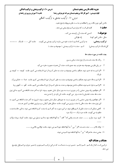 چزوه و درسنامه و تست کتاب فارسی درس 10: ترکیب وصفی و ترکیب اضافی پایه پنجم دبستان