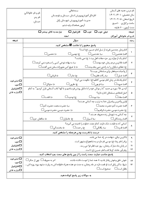 آزمون نوبت دوم هدیههای آسمانی ششم هماهنگ ناحیه زابل | خرداد 1402