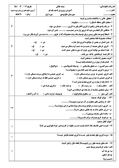 آزمون ارزشیابی میان ترم دوم علوم تجربی فصل 7 تا 12 پایه هفتم