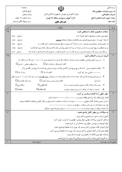 نمونه سوال امتحانی پودمانی تزئینات سلولزی، رنگ موکت و فضاهای داخلی فصل 1تا 4 پایه دهم همراه با پاسخنامه تشریحی