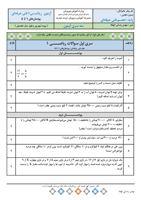 سه سری آزمون پودمانی ریاضی (1) فنی حرفه ای دهم هنرستان | پودمان 1 تا پودمان 5 ( ویژه شهریور و طول سال تحصیلی)