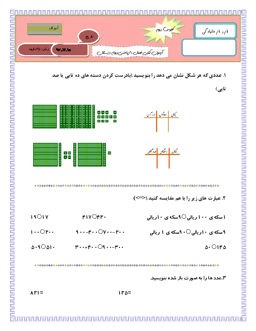 نمونه سوال امتحانی ریاضی فصل 6:جمع و تفریق اعداد سه رقمی پایه دوم دبستان