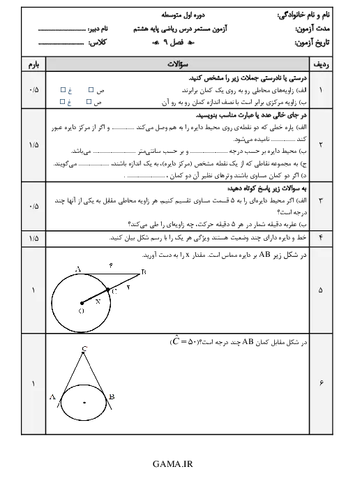نمونه سوالات امتحانی مستمر فصل 9 دایره ریاضی هشتم دبیرستان همراه با پاسخنامه تشریحی
