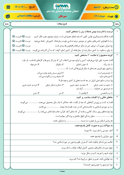 سوالات آزمون نوبت دوم مطالعات اجتماعی ششم هماهنگ سیرجان | خرداد 1401