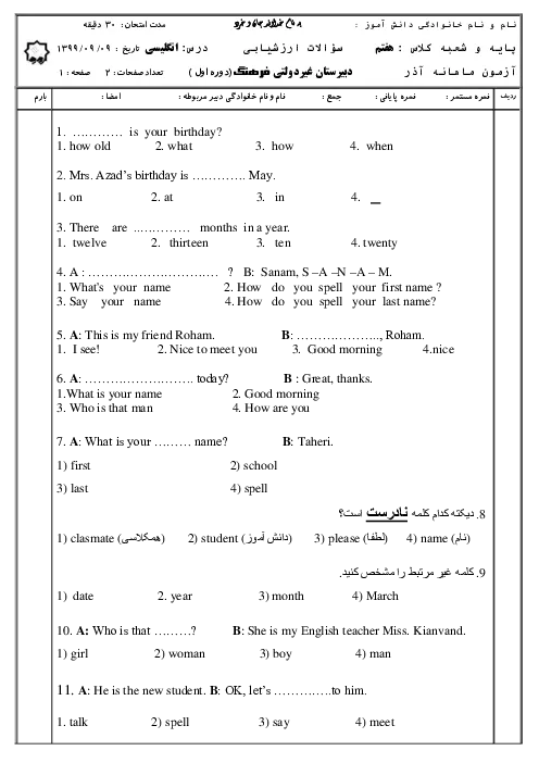 مباحث :\nLesson 1: My Name\nLesson 2: My Classmates\nLesson 3: My Age\n\nدر این مجموعه 20 تست با درجه سختی آسان تا سخت (پنجاه درصد متوسط) با محوریت نکات دستوری، معنی لغت، دیکته و تلفظ (spelling) با هدف مرور نکات درسی و تخصیص نمره مستمر و ماهانه در اختیار شما قرار می گیرد.