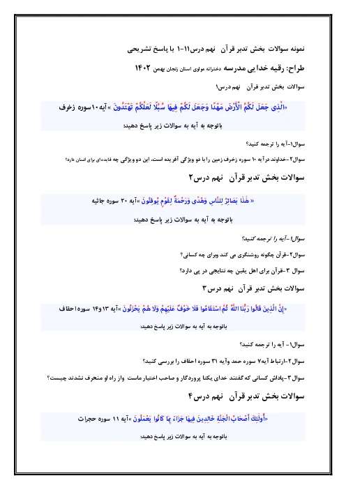نمونه سوالات تدبر در قران درس به درس پایه نهم ترجمه ایات و مفهومی وبا پاسخنامه تشریحی بهمن1402