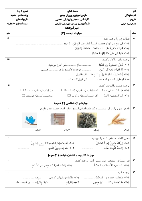 نمونه سوال امتحان عربی هشتم | درس 7 و 8
