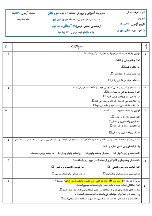 نمونه سوال امتحانی تستی نوبت دوم پیام آسمانی درس 1 تا 15 پایه هشتم همراه با پاسخنامه کلیدی